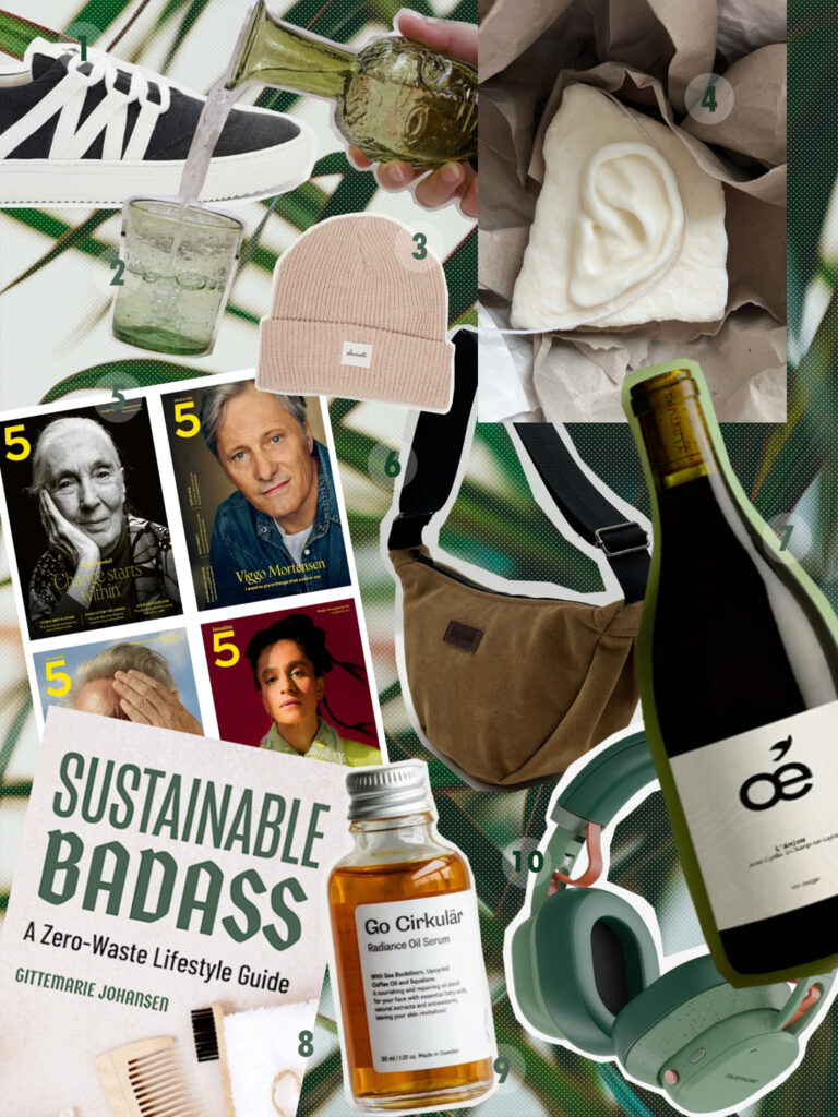 1. Vaer upcycled sneakers // 2. La Soufflerie recycled glass // 3. Pleasant upcycled beanie // 4. Karoline Studio soy candle // 5. Imagine5 subscription // 6. Bagabu banana bag // 7. Oé wine // 8. Sustainable Badass // 9. Go Circular upcycled skincare // 10. Fair Phone headphones